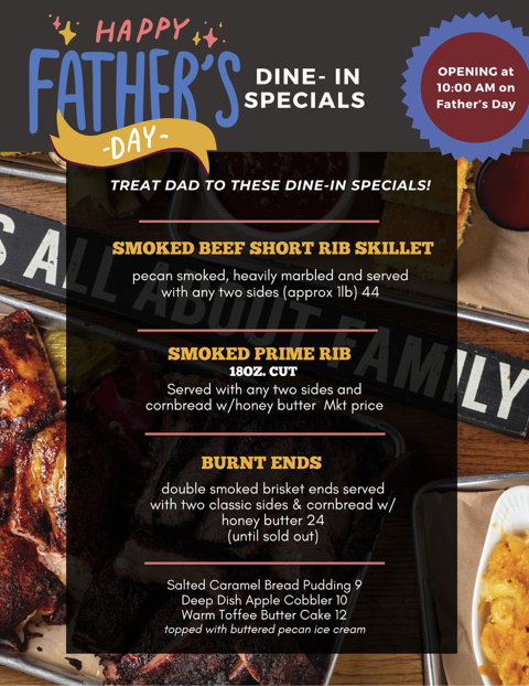 18OZ. USDA Angus choice, Pecan smoked & served with any two sides and cornbread w/honey butter