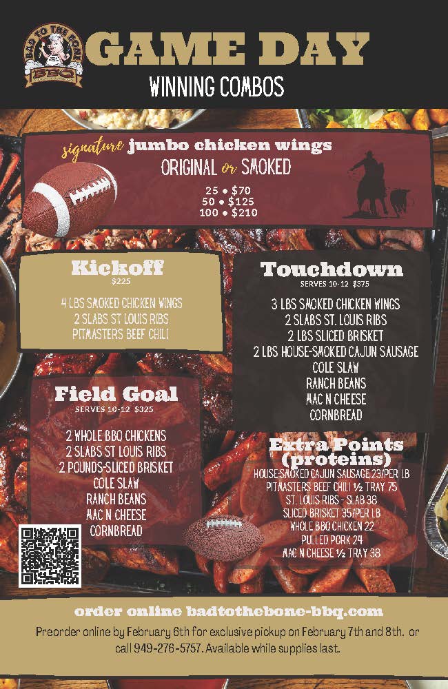 2 slabs of St. Louis Ribs, 1 lb. Beef Brisket, 1lb. Pulled Pork, 1 whole BBQ Chicken •$235