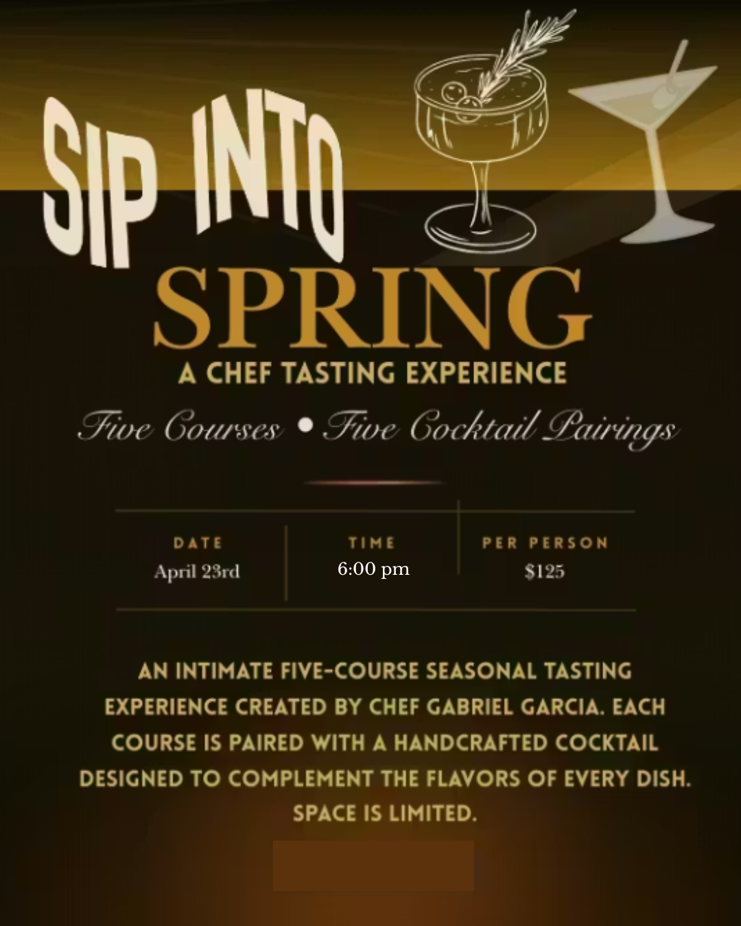 Five-course spring tasting with cocktail pairings by Chef Gabriel Garcia. One night only.